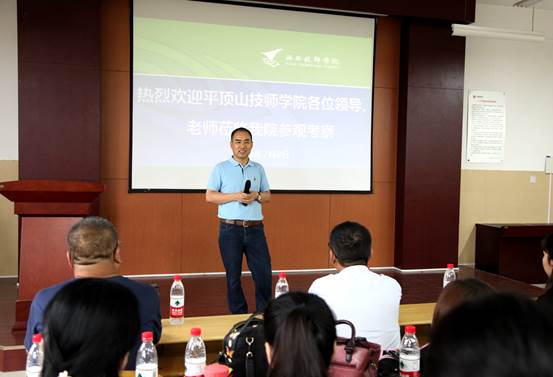 7月9日,平顶山技师学院周宝西院长、吕培元副院长等一行90余人来我院参观交流。学院副院长冯小平热情接待考察人员并简单介绍了我院的基本情况。