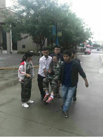 (图为学生工作处处长崔嵬(右一)带领工作人员和学生抬着受伤学生去医院接受治疗)