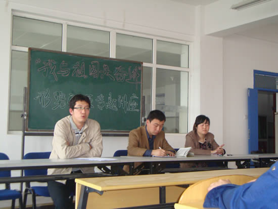 学院团委书记杨坤结合当前社会形势和我院学生特点,充分讲述了自建国以来社会的发展,就“如何与祖国共成长”杨坤老师列举了“龟兔赛跑”的寓言故事及当代大学生幸福生活的实例,并对“十二五”规划的美好前景进行展望。