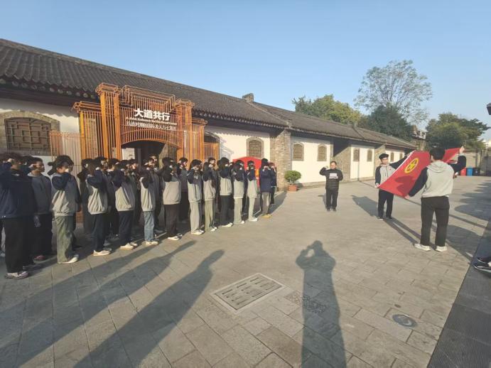 庄严肃穆的氛围笼罩着纪念馆广场,鲜艳的团旗迎风招展,铿锵的誓言掷地有声。在学院团总支书记胡艺潇的带领下,全体团员青年面向团旗,整齐列队,高举右拳,重温入团誓词。“我志愿加入中国共产主义青年团……”坚定而洪亮的宣誓声在革命旧址上空回荡,充分展现了新时代青年坚定不移听党话、跟党走,为共产主义事业不懈奋斗的坚定信念与青春担当。