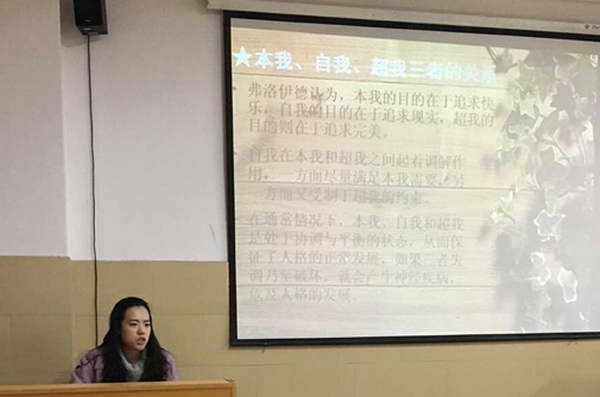 刘薇老师在讲“佛洛依德人格理论”。 在刘老师的讲解和分析下,专业的理论知识深入浅出、浅显易懂。