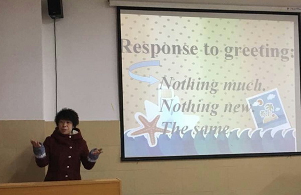 刘婷老师在讲“Greeting people met often”刘老师把耳熟能详的问候语一一道来,使学生在信心满满的口语交流之余,收获了地道的美式口语。
