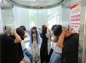 电梯脱困演练正式开始。学生在正常使用电梯时,出现突发情况,电梯突然停止运行,轿厢内学生全部被困,被困人员拨打救援电话,现场老师一方面联系电梯维保公司实施救援,一方面对被困人员情绪、心理进行安抚,对被困人员进行指导,靠墙、半蹲、抱头进行现场自救。电梯维保公司接到救援电话后第一时间到达现场,实施救援,最后将被困人员安全解救。